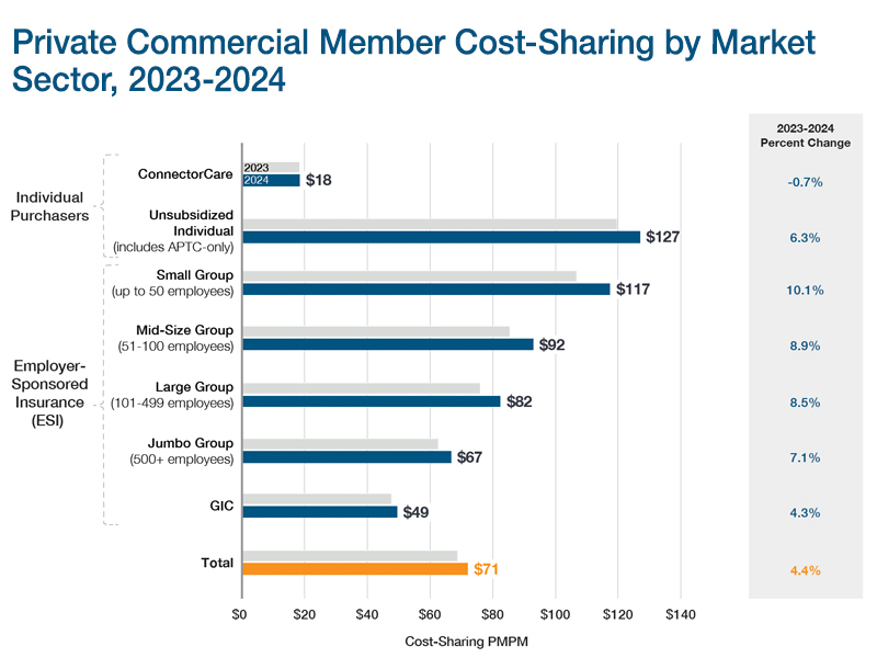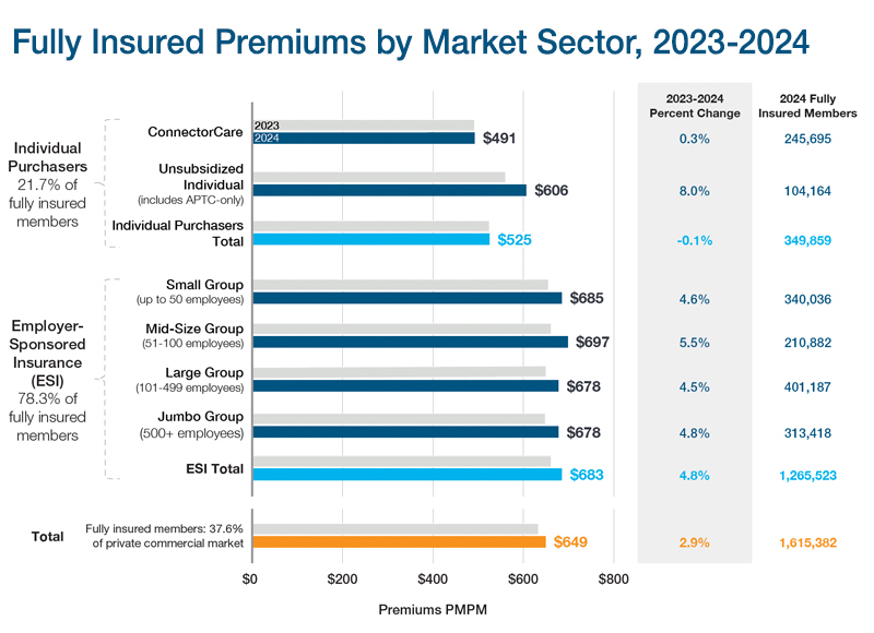 Fully insured premiums grew more slowly in 2024 (2.9%) than in prior years (5.9% in 2023), driven by enrollment shifts in the individual purchaser sector to lower premium ConnectorCare plans. Premiums for individual purchaser plans declined 0.1% overall, while premiums for employer-sponsored plans increased 4.8%.