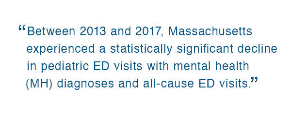 About 1 in 5 children have mental health care needs, yet most children with needs are not connected to appropriate or timely mental health care. In turn, they may rely on the ED for mental health care or may end up using the ED when the underlying issue could have been otherwise managed through appropriate screening and treatment in an outpatient setting. These pediatric mental health care challenges have grown over time, as reflected by increasing rates of pediatric mental health-related ED visits across the U.S. However, Massachusetts has been a leader in pediatric mental health for nearly two decades, with a number of policies and initiatives in place that aim to improve access to pediatric mental health services. Therefore, we sought to explore whether the policy environment of Massachusetts may have led to different trends in pediatric mental health ED visits as compared to what we see nationwide.