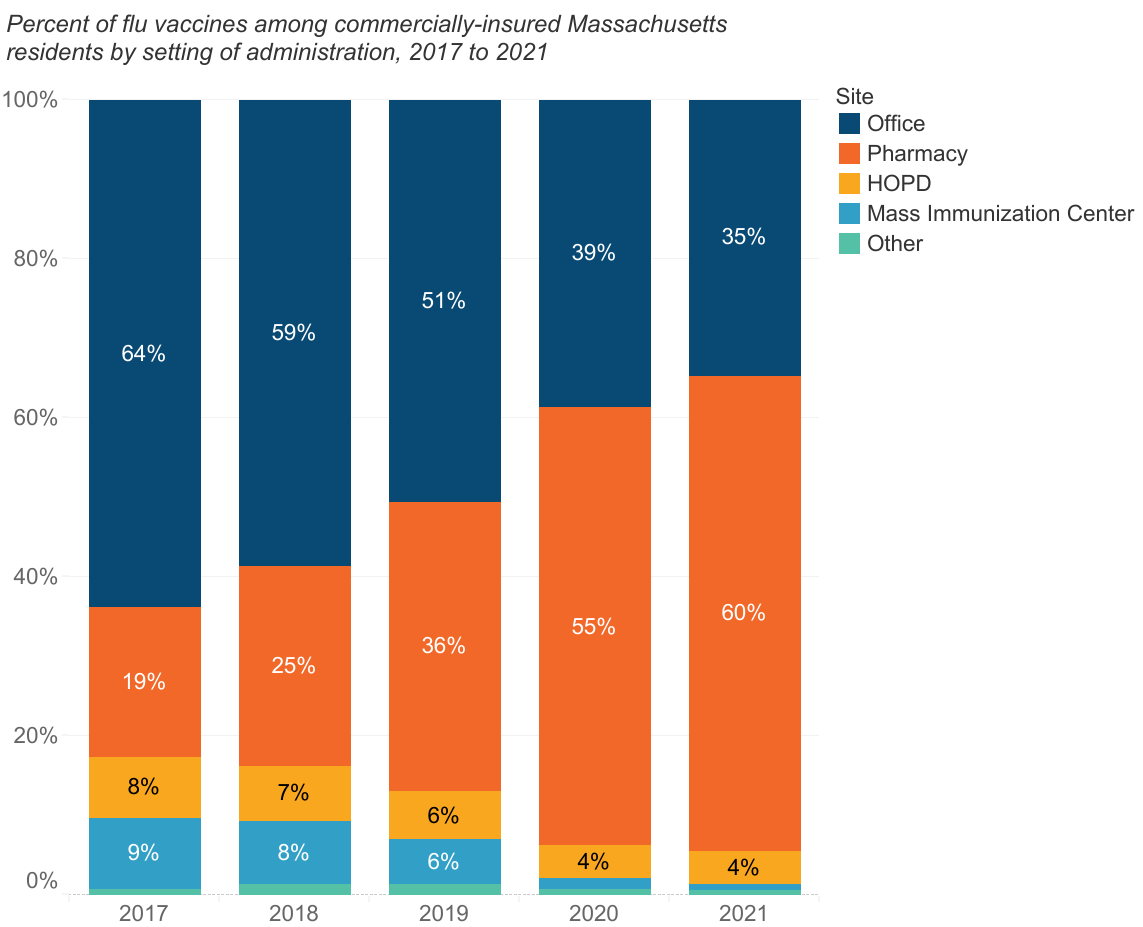Influenza (flu) vaccines are widely considered to be an important preventive care service, having been found to reduce severity of illness and the risk of flu-associated hospitalization. Massachusetts has a higher flu vaccination rate than the national average (64.9% versus 49.3% during the 2022-2023 influenza season, respectively), and that rate has increased over time. Flu vaccines can be administered in a variety of settings, including doctors’ offices, hospital outpatient departments (HOPDs), pharmacies and retail clinics, and mass immunization centers, and different settings of vaccine administration may have different spending and access implications.
