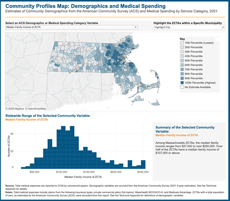 This publication includes data on demographics by community as well as the relationship between these community characteristics and total medical expenses (TME) by insurance population and across TME service categories for data year 2021. Data is presented at the community level by municipality and ZIP Code Tabulation Area (ZCTA).