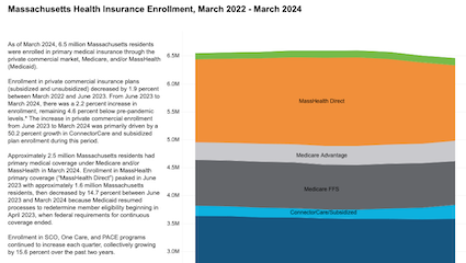 CHIA just published its latest interactive dashboard of Enrollment Trends, offering new insights into changes in health insurance coverage in Massachusetts from March 2022 through March 2024. The interactive dashboard includes enrollment breakouts by payers and product types in private commercial and public market sectors.