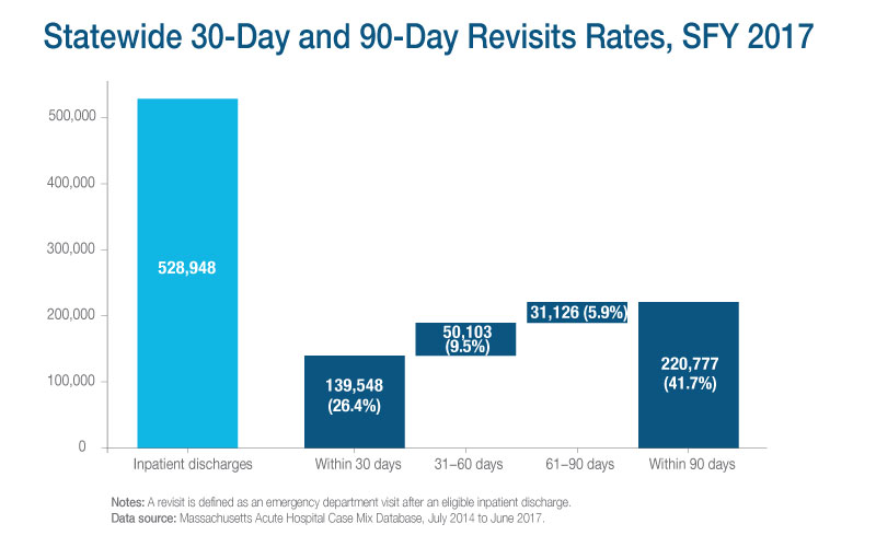 In CHIA's newest report Emergency Department Visits After Inpatient Discharge: SFY2017, CHIA analyzes emergency department (ED) revisits within 30 days of a patient's inpatient discharge. This June 2019 publication includes a comprehensive report, databook, technical appendix, and the key findings below.